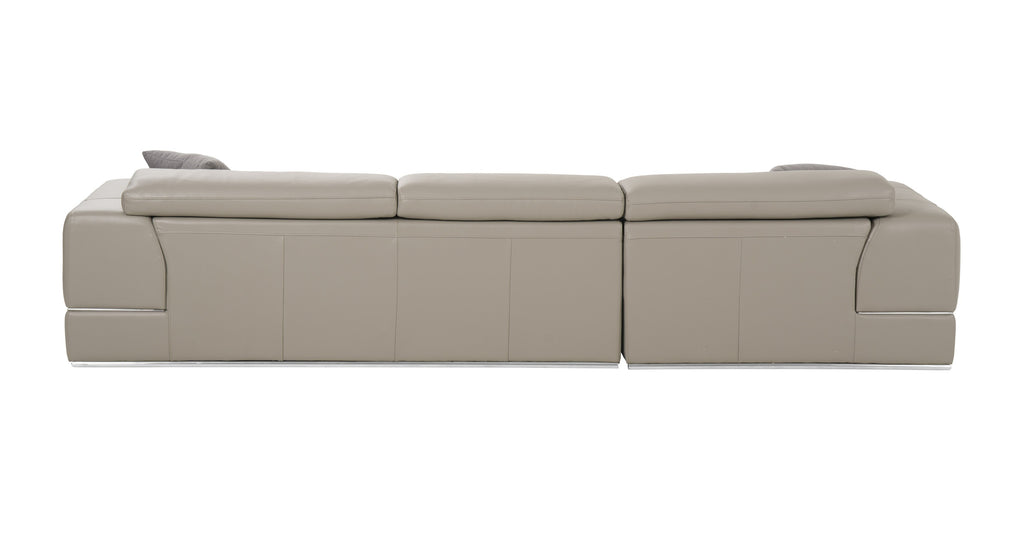 Versatile and modern, the Divani Casa Pella Mini Modern Grey Leather Sectional Sofa is stylish and compact enough to fit a small space. It consists of a left facing chaise and a love seat that is adequately wide that promote convenience. It features three adjustable headrests and slide-out cushions providing your ergonomic support, allowing you to relax better while seated or lazing down on the chaise. It is fitted with a dark brown armrest tray beside the chaise where you can put your cup, drinks or snacks while reading a book or watching a movie. Chrome accents lend a striking blend while plastic legs provide sturdy support to this modern sectional sofa.