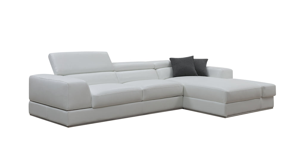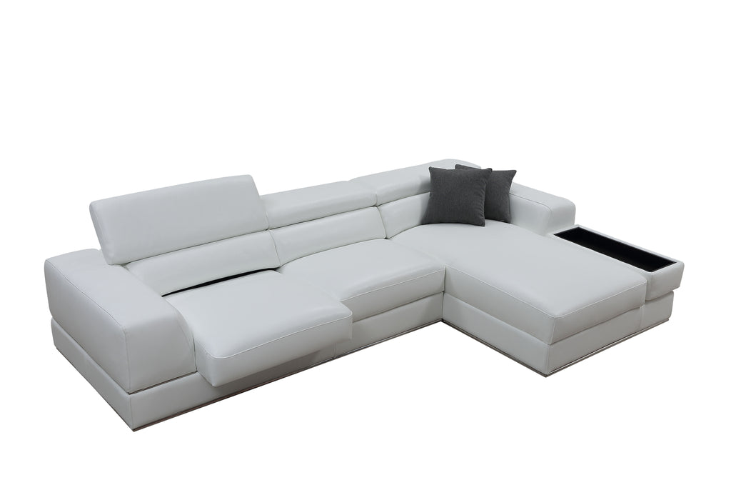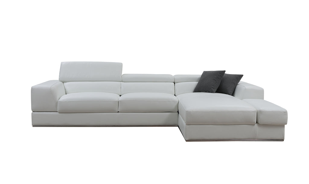 Versatile and modern, the Divani Casa Pella Mini Modern White Leather Sectional Sofa is stylish and compact enough to fit... Versatile and modern, the Divani Casa Pella Mini Modern White Leather Sectional Sofa is stylish and compact enough to fit a small space. It consists of a right facing chaise and a love seat that is adequately wide that promote convenience. It features three adjustable headrests and slide-out cushions providing your ergonomic support, allowing you to relax better while seated or lazing down on the chaise. It is fitted with a dark brown armrest tray beside the chaise where you can put your cup, drinks or snacks while reading a book or watching a movie. Chrome accents lend a striking blend while plastic legs provide sturdy support to this modern sectional sofa. Upholstered In Italian Leather/Leather SplitColor: White Cat.3 4020/SplitLeft Facing ChaiseSlide Out Seat Cushions3 Adjustable HeadrestsBrown Armrest TrayChrome AccentsPlastic LegsAvailable In Other Upholstery By Special Order (10-16 Weeks)Sofa Care Instructions View more