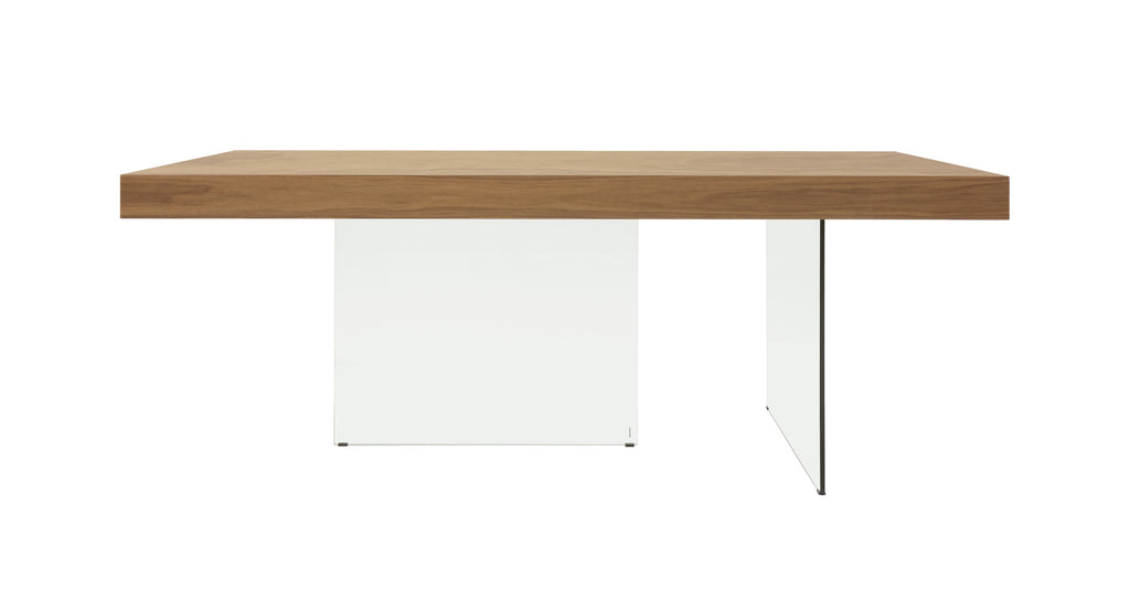 Bestowing your dining room subtle sophistication is the Modrest Encino Modern Walnut & Glass Dining Table. Constructed with a rectangular Walnut Veneer finish table top, it uses clear tempered glass for its legs that added to its allure. With floor protectors, the legs position makes a stunning sight, as one was placed in the center while the other was on the right facing side. This shows artistic imagination and creates a floating impression. Seating 6-8 comfortably, this remarkably designed modern dining table creates a beautiful modern statement to your home.