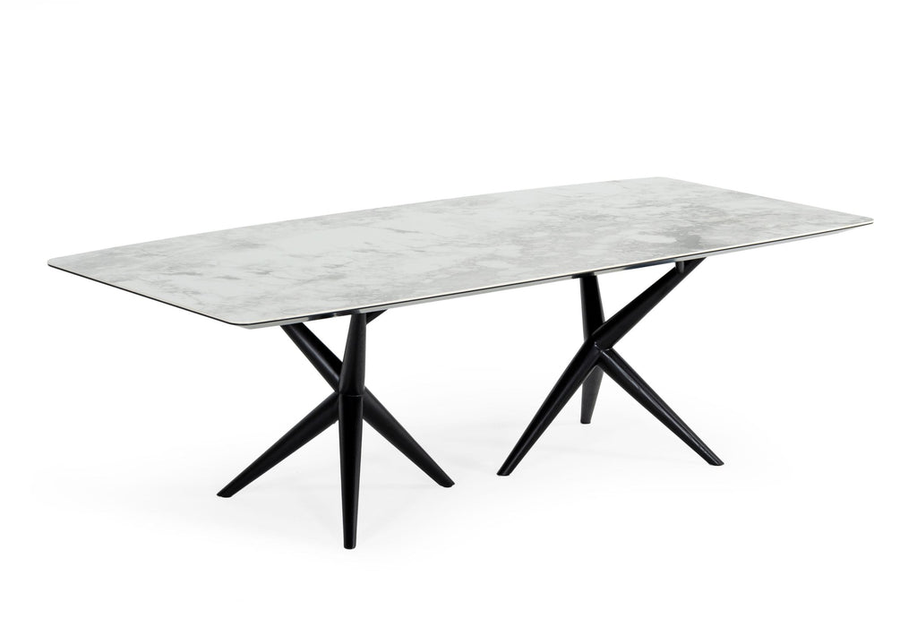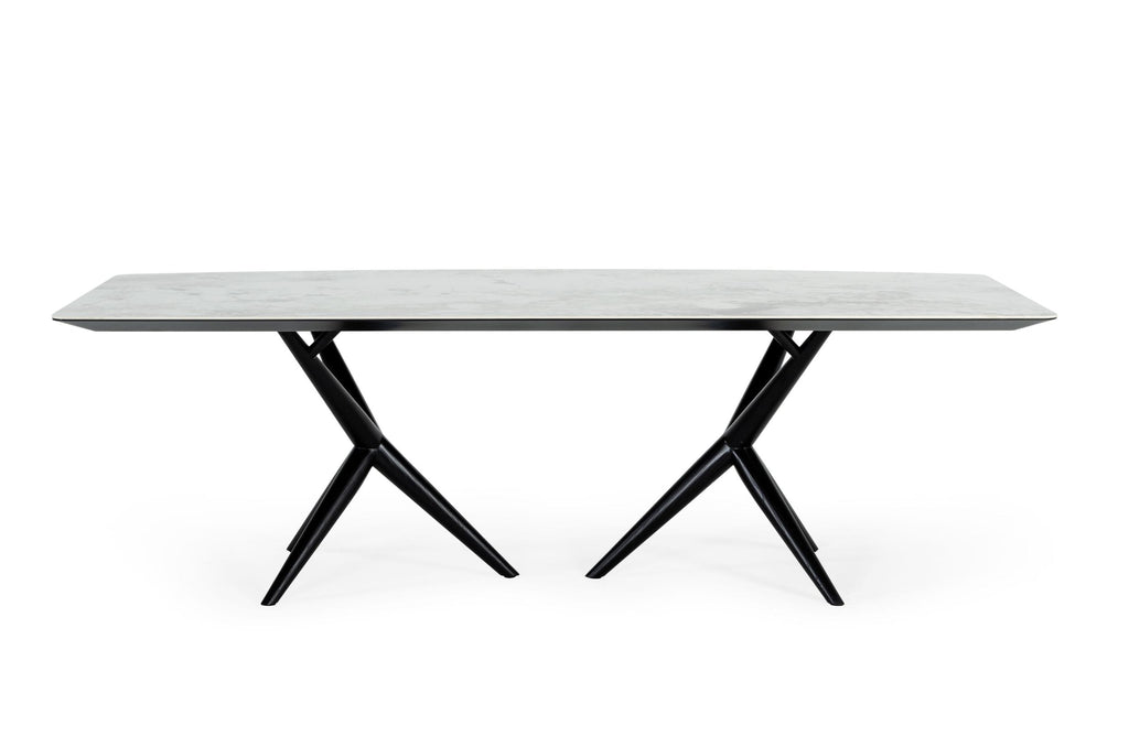 The Stetson Dining Table is the perfect abstract dining table for your modern home. The teepee style leg is finished in a smoked ash while the top is a white ceramic with a marble look finish. This modern table pairs perfectly with other modern or contemporary pieces.
