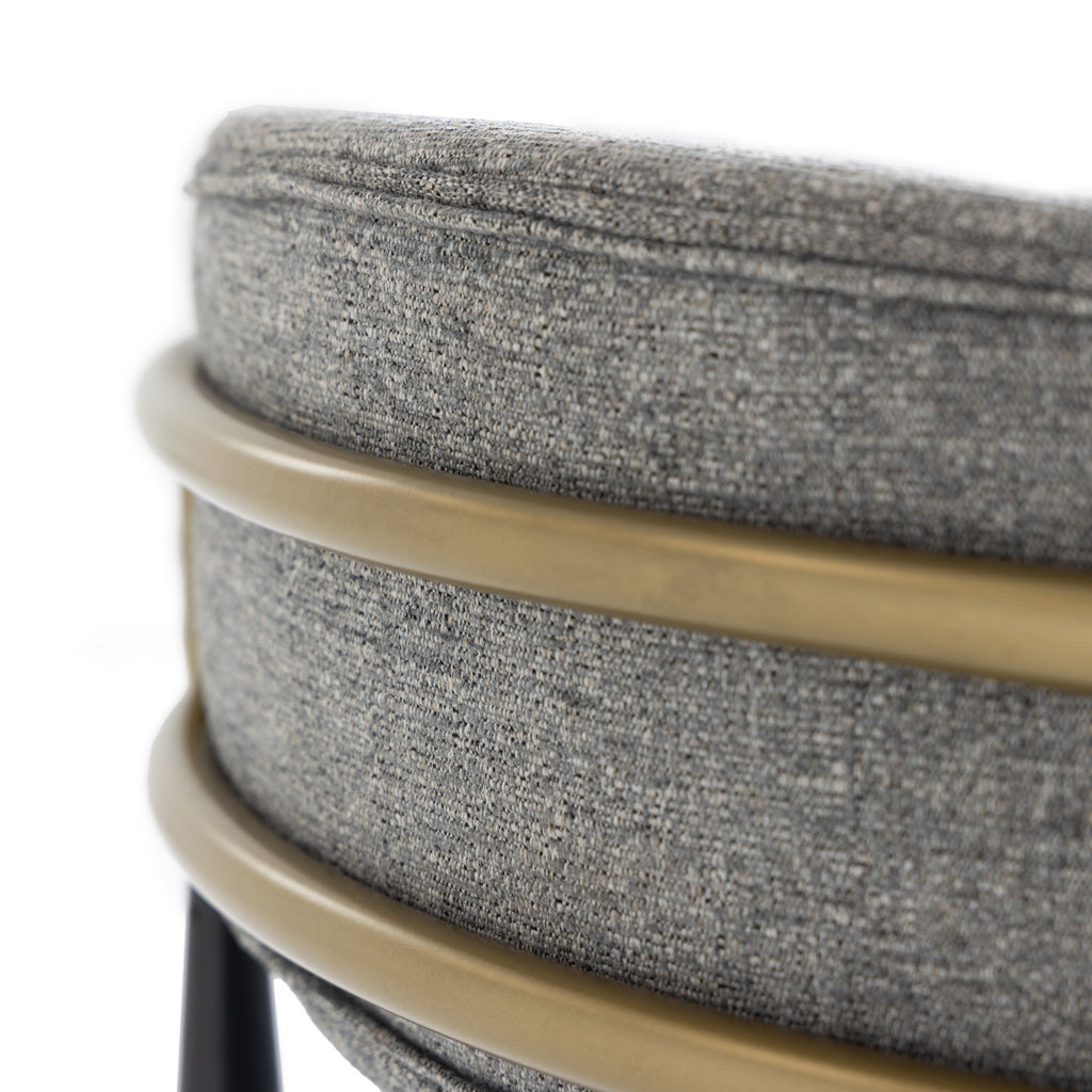 Dining Armchair Grey 17AK06-7 Fabric Upholstery 100% Polyester Fabric Gold Metal Armrests Black Iron Legs Foam Padded Seat & Backrest Back Style: Curved Back Plastic Glides To Prevent Scratching Product Care: Wipe clean with a dry cloth. Do NOT use strong liquid cleaners Weight Capacity: 264 Lbs. No Assembly Required