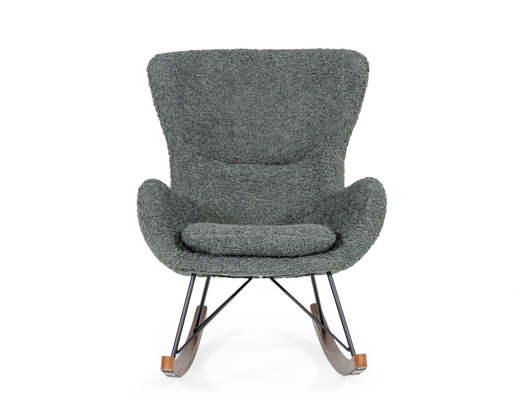 The Ikard Rocking Chair is a mid-century style rocking chair with a modern twist. The upholstery is a lovely grey sheep-style fabric. that creates a cozy aesthetic. Perfect for the colder months for cuddling up with a good book. The rails are textured walnut wood that creates a cabin look. The black powder-coated frame lends itself to an industrial style.