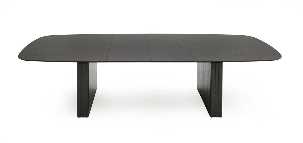 The Calhoun Extendable Dining Table is the perfect modern dining table for a modern home. The slatted, smoked oak veneer, pedestal legs of this gorgeous table create a dramatic silhouette for this table. The table seats six to eight when in its standard position and seats ten when fully extended.