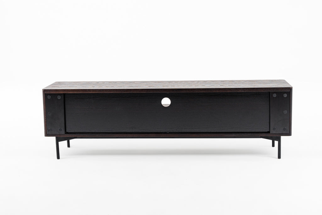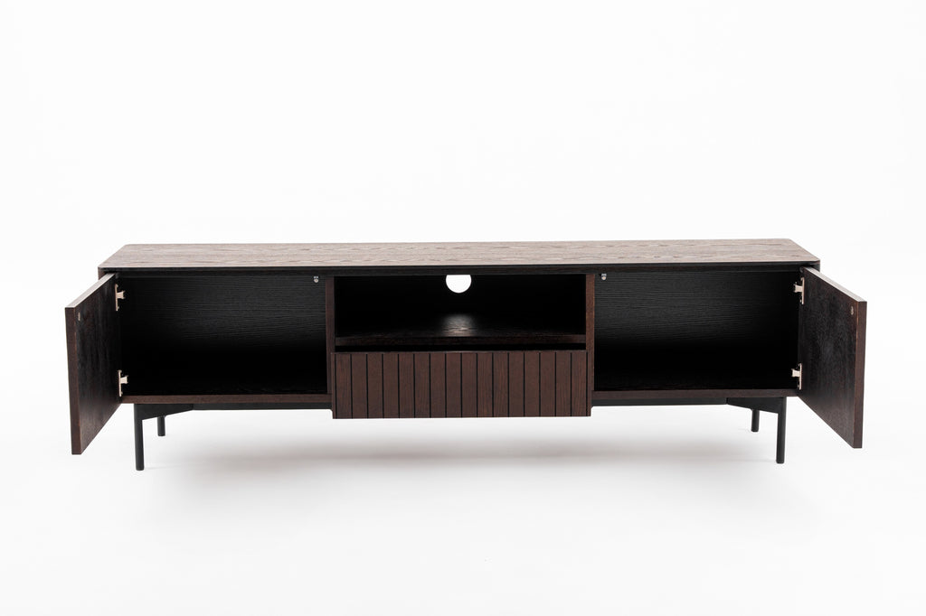 The Calhoun Tv Stand is a beautiful modern style unit, perfect for our contemporary home. The vertically slatted smoked ash veneer facing is beautiful and effective. The black metal powder coated legs add a rustic industrial touch to this engaging piece. two side cabinets with interior shelving and one soft closing drawer. A space for chords adorns the back creating ultimate functionality.