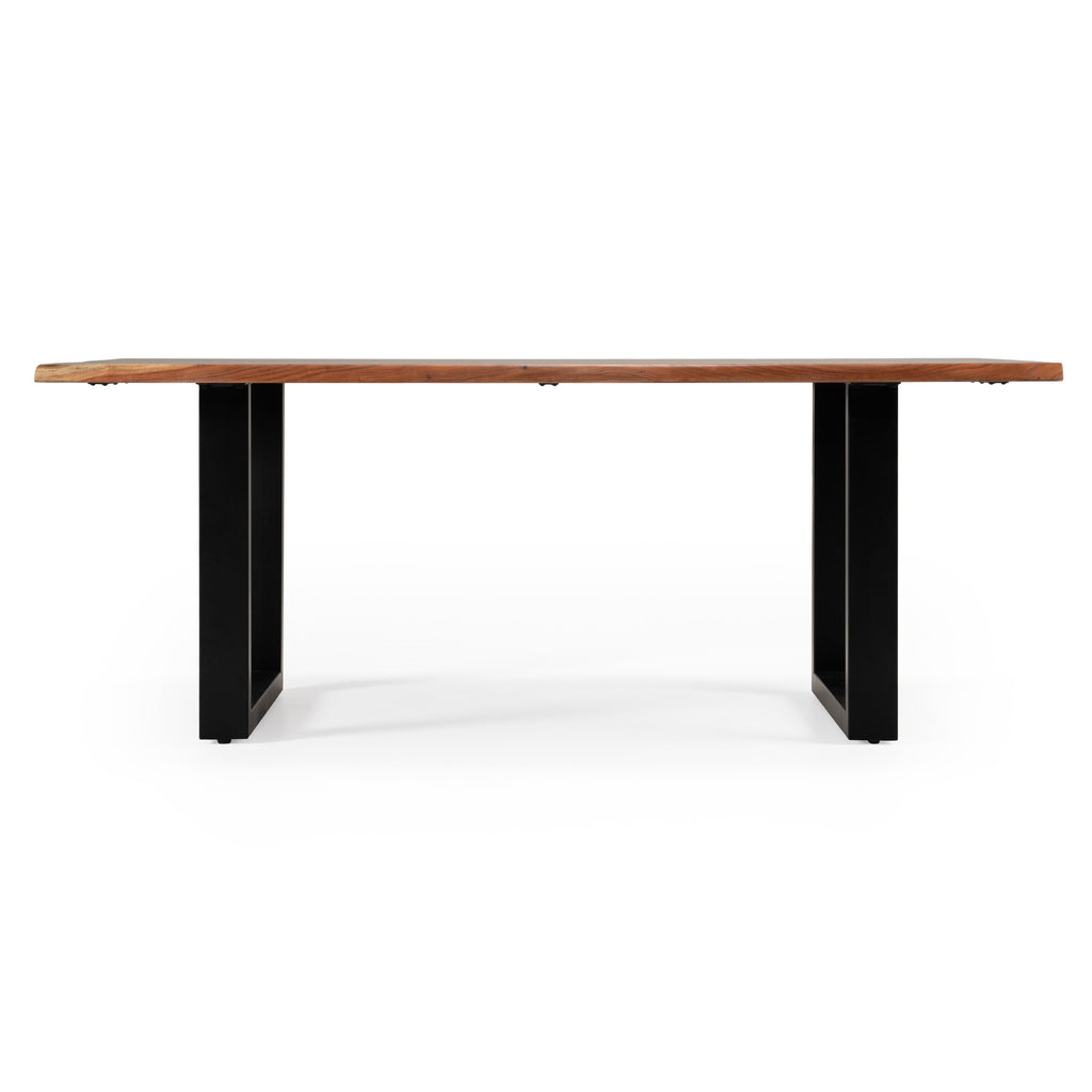 Natural wood is the earmark of the Modrest Taylor Modern Live Edge Wood Dining Table that can seat 6 comfortably. Constructed of solid Acacia wood, it has a rectangular 1 1/2-inch table top with a rustic and clean finish. The character and hue of the wood grains on the clean finish and the weathered edges made it even more enticing and interesting. Placed atop U-shaped black metal legs, this dining table has a minimal impact on the environment as wood forests are renewable.