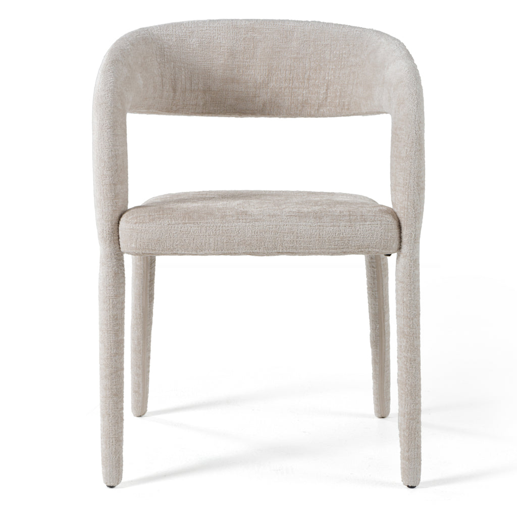 The Modrest Faerron is a striking modern dining chair that features a sleek, light grey fabric upholstery, adding a touch of contemporary elegance to any dining space. Its unique curved backrest and armrests provide both comfort and style, creating an inviting atmosphere. The minimalist design, complemented by gently contoured legs, ensures this chair seamlessly fits into various decor styles, making it a perfect choice for sophisticated dining settings.