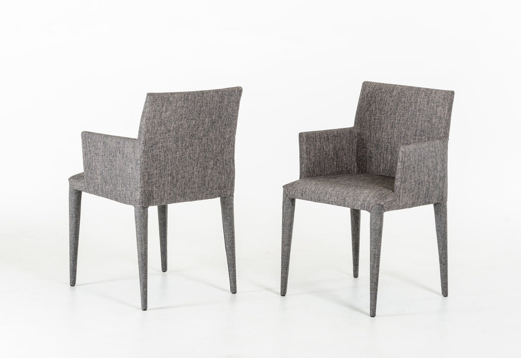 Upholstered in grey polyester fabric, the Medford Dining Chair is easy to match with existing home decor themes. The modern inspired design features a sturdy steel metal frame, foam cushioning, a solid back, armrests and tapered legs. Ergonomically and visually designed, the Medford will enhance your dining experience. Approved for residential and commercial use.