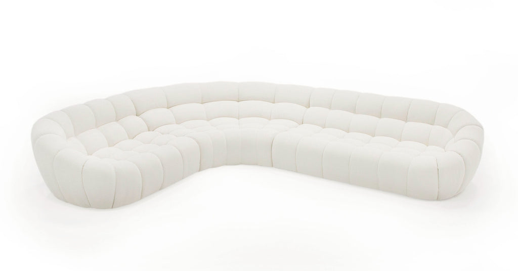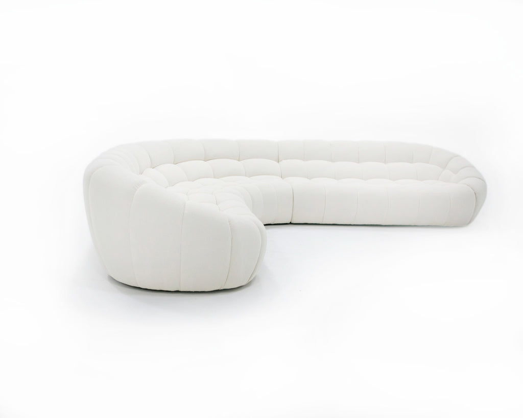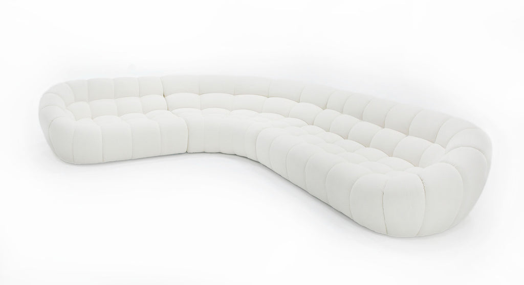 The Yolonda Sectional is a Curved Modern Off-White Sofa, offering an alternative centerpiece to your living room. The hexagonal tufted cushions provide a unique, non-traditional and stylish design for the sofa as well as the teddy fabric upholstery providing maximum comfort.The Yolonda also comes in a Sofa, Loveseat and Accent Chair.