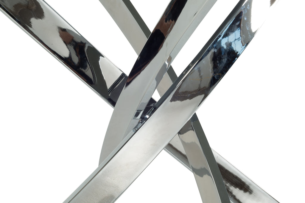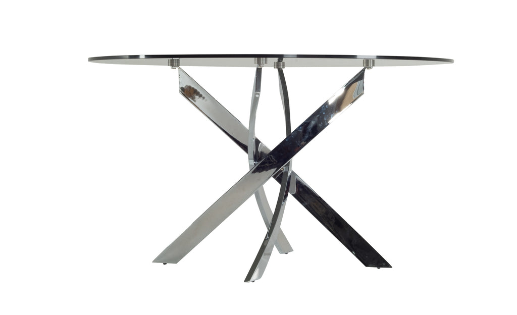 Circular clear tempered glass is held up by entwining chrome legs to create a poised composition. Table comfortably fits four people. Also available as a rectangular table.