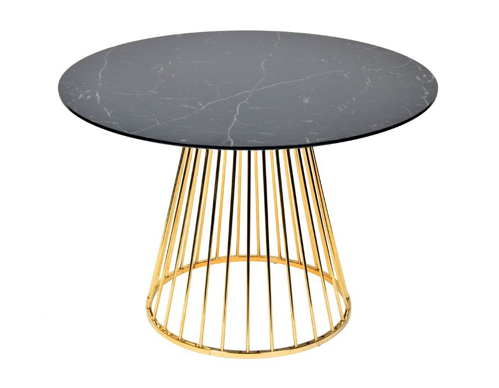 Get an industrial dining room style with the Modrest Holly Modern Black & Gold Round Dining Table. Perched on a gold stainless steel base that features an openwork design is the round 43-inch diameter black paper tabletop with clear varnish. This dining table sets a new touch by incorporating a modern industrial design style in your dining space that will impress your guests. Large enough to seat four people comfortably, this modern dining table fits any type of home décor.