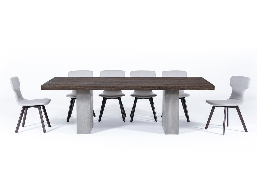 A splendid combination of oak and concrete, the Modrest Renzo Modern Oak & Concrete Dining Table exudes an organic elegance. Featuring a rectangular heritage Oak table top with wood markings, it is perched on solid dark grey fiber reinforced natural concrete base. The rawness of the materials used emphasized the eco-friendly feel of this modern dining table that will add warmth to your dining room.