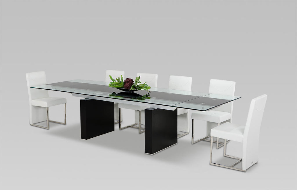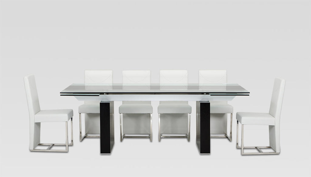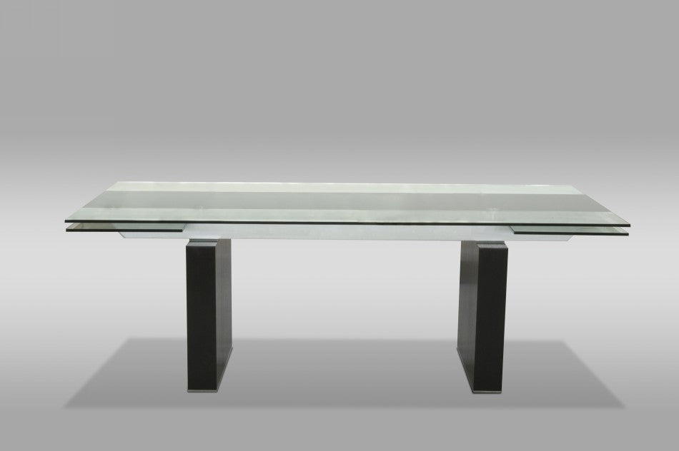 The Lisbon Dining Table is the perfect modern table for your large family. Extending up to ten feet in length, this magnificent table can seat between eight and twelve people, making it an extremely functional option for your home. The dark contemporary wenge finish adds contrast to the crisp clear glass top. Silver inner working of the table are viewable from the top of the piece, inviting everyone into the lovely craftsmanship of this table. Pair with a black vegan leather chair for a perfect pair.