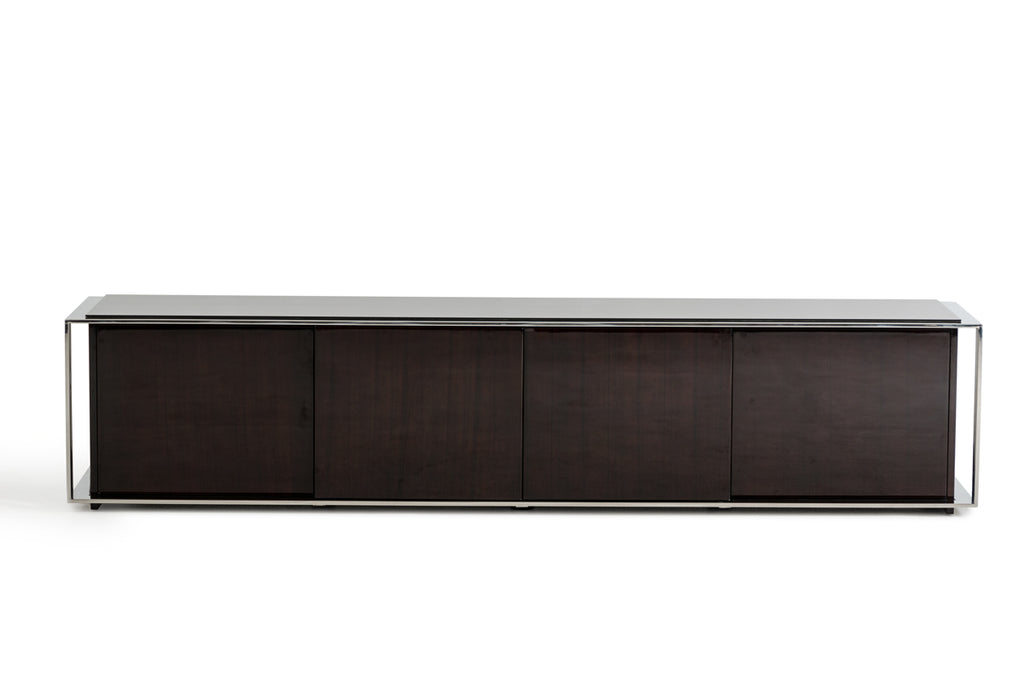 The sleek Noble TV entertainment center features a glossy ebony lacquer finish accented by stainless steel trim and frame. Four doors with push open technology hide the four cubed storage shelves inside. Matches the Noble coffee table.