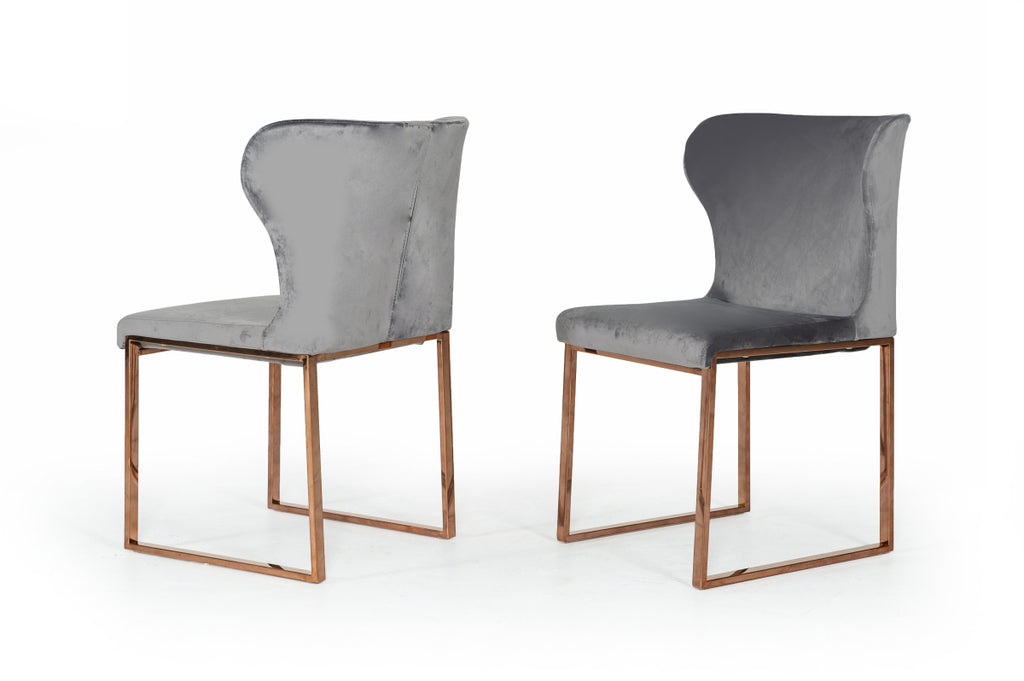 Suave and chic emanates from the Modrest Chadwick Modern Grey Velvet & Rose gold Dining Chair. Upholstered in plush grey velvet, it features a wing-back design that seems to engulf you with its warmth and softness. The full seat design offers much comfort as it accommodates your bottom fully. This modern dining chair stands on square Rose gold stainless steel legs that complete its alluring look.