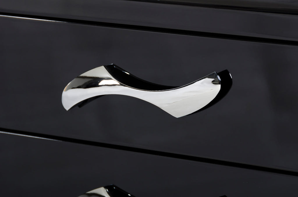 The Monte Carlo black nightstand features a smooth black lacquer finish, offering functionality with its two drawers. Accentuating the drawers are the curvy stainless steel pulls. The wavy bottom edges matches well with the arched sides. Measuring 22"x14"x24", this nightstand stands on a transitional leg design that completes its charming look.