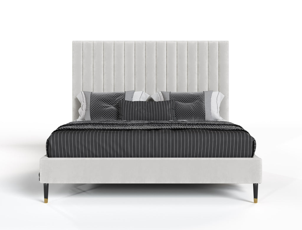 Create a simple yet elegant style in your bedroom with the Modrest Hemlock Contemporary White Fabric Bed. Donning a tall headrest with a pleated design in front, it is upholstered in soothing white velvet fabric. Complementing the headrest is a sunken mattress frame with slats to ensure good aeration and to keep the mattress in place even if you move a lot while asleep. This modern bed serves your sleeping needs perfectly and adequately, making your bedroom a quiet resting area. Tapered legs with gold rings on each end provide sturdy support.