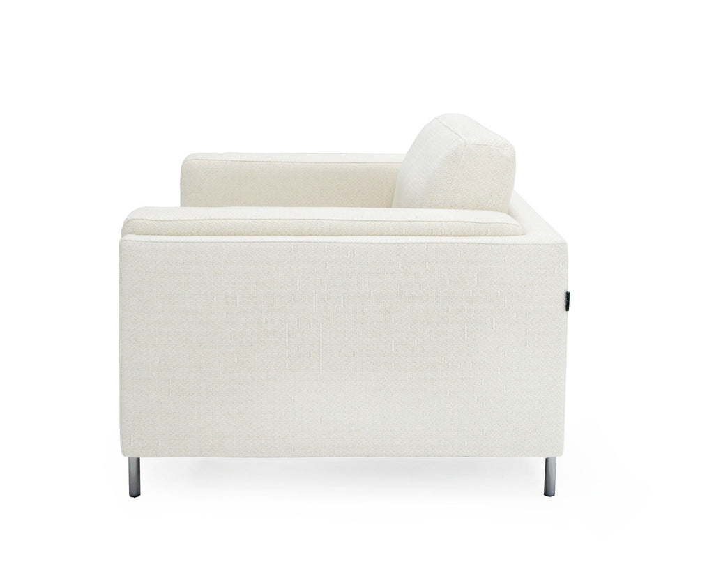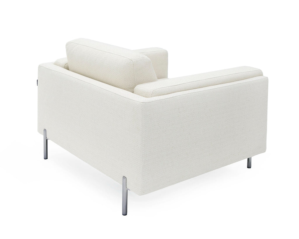 The Schmidt Accent Chair, part of the Divani Casa Collection, has a low & lean silhouette with Tuxedo square arms. A very comfortable seat in classic modern style upholstered in off-white Dinara natural fabric and accented with grey metal legs. The Schmidt pairs nicely with the matching Sofa.
