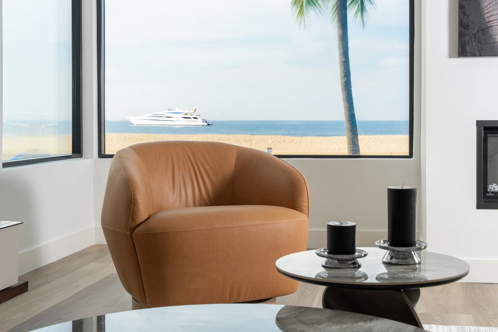 The Divani Casa Agatha Modern Tan Leather Swivel Accent Chair exudes contemporary elegance with its smooth, rounded shape and plush cushioning. Upholstered in a rich tan leather, it offers both style and comfort, making it a perfect addition to any modern living space. The chair rests on a sturdy swivel base, allowing for easy movement, while its soft lines and inviting design create a warm, welcoming atmosphere. Ideal for cozy nooks or as a statement piece in a larger room, this accent chair harmonizes luxury with functionality.