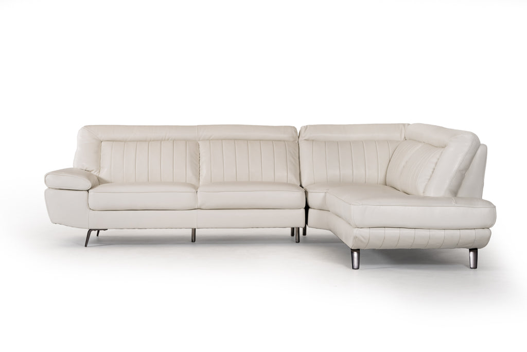 The Divani Casa Galway Modern White Leather Sectional Sofa brings exceptional style and optimal comfort to your home featuring delicate white R715 full genuine leather upholstery. It features flared arm, a comfy right facing chaise and vertical stitching accent on the back. Sturdy stainless steel legs provide support to this sectional sofa.