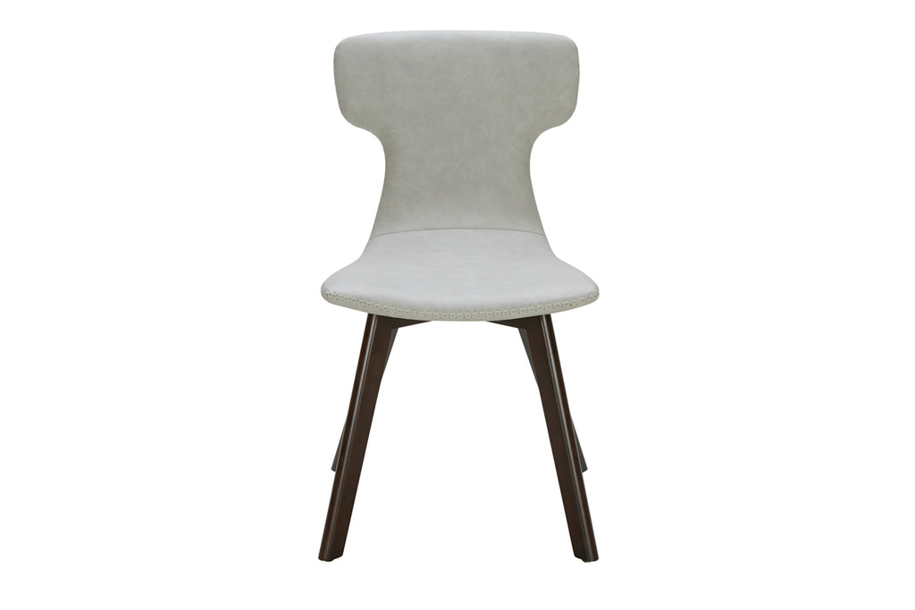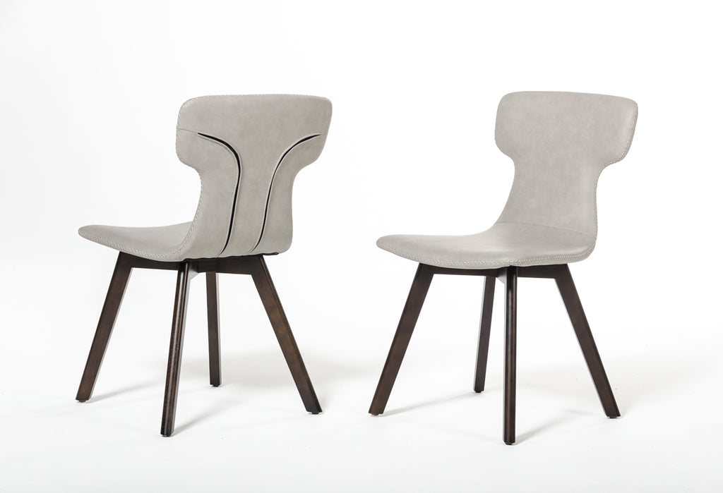The Modrest Zach Modern Grey Eco-Leather Dining Chair features a bodice-like back design upholstered in light grey CU0152 eco-leather. Durability is seen with the stitched edges and features a stitched brown accent at the back. Sturdy brown wooden legs provide durable support to this chair. Sold in sets of 2, this modern dining chair has a seat depth of 16" and a seat height of 17" and a dimension of W17" x D23" x H33".