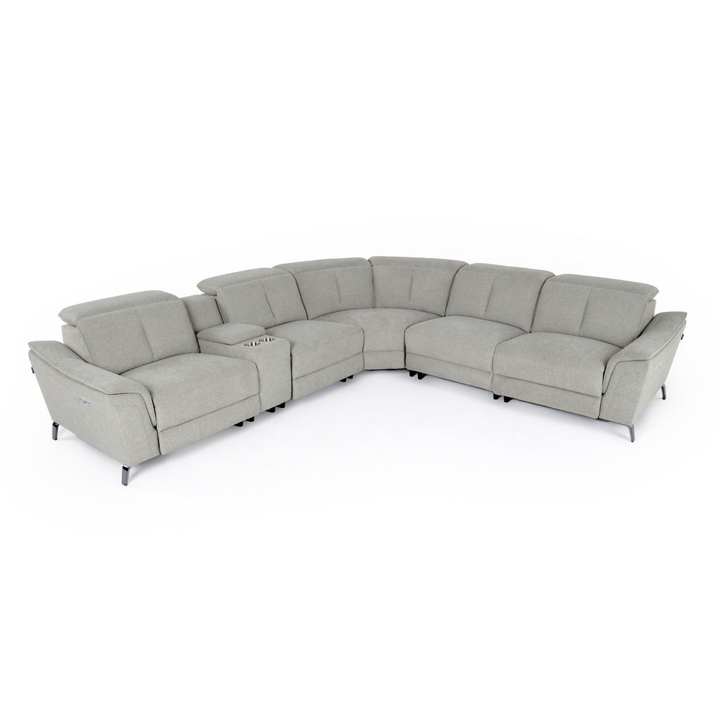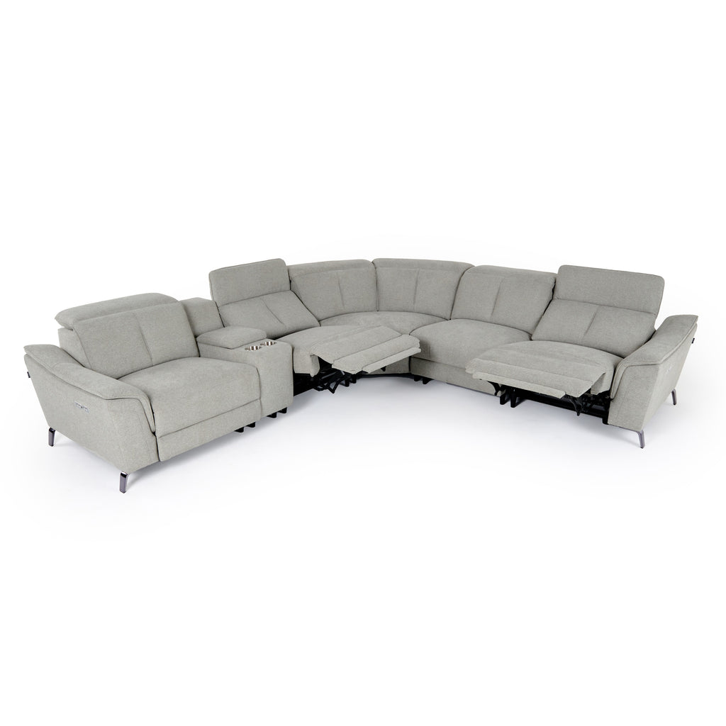 The Llyod Sectional is a perfect addition to your family home. With seating up to six, this large sectional is perfect for entertaining. Three power recliners make this the perfect option for relaxing in front of the television. Adjustable headrests make this an even more versatile sectional. With fabric upholstery in a lovely grey, this sectional is certainly a cozy addition to any contemporary home.