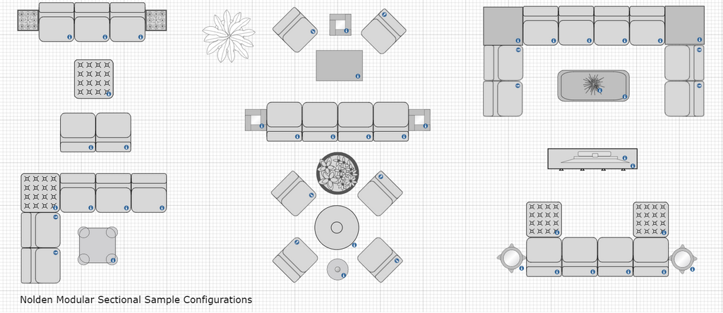 The Nolden sectional is a contemporary exhibit of modular design. The set includes 3-armless single seaters, a corner seat and an ottoman. Upholstered in a grey textured fabric, all of the seats and backs contain high density (1.9)foam for maximal comfort and optimal support. the low profile seat cushions are double welted with square stitched tufting on the seat, the back cushions are double welted as well, and held up with bolsters. The modularity of the sofa allows custom configuration, so you can make the piece fit your living space.