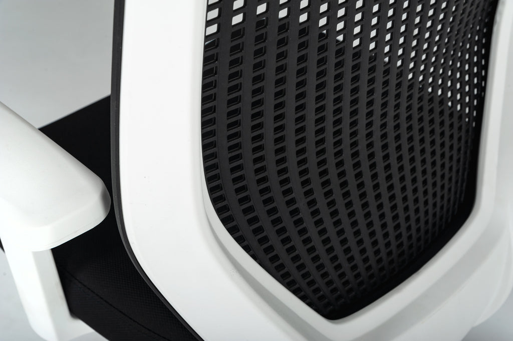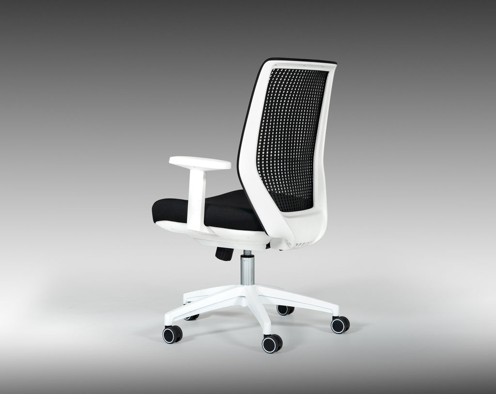 The Modrest Bayer Modern Black & White Office Chair presents an ergonomic design featuring a dainty white plastic base and legs. It features an airy black high back height design with thick black cushioned seat. Designed for continuous use, it features a tilt control, an adjustable seat height, T-bar shaped armrests, and a full circle swivel capability. The 5-star rolling base is fitted with casters for ease of movement. Weighing 300 lbs., this modern office chair has a dimension of W24" x D23" x H38/41" with a seat height of 18" - 21" and requires assembly.