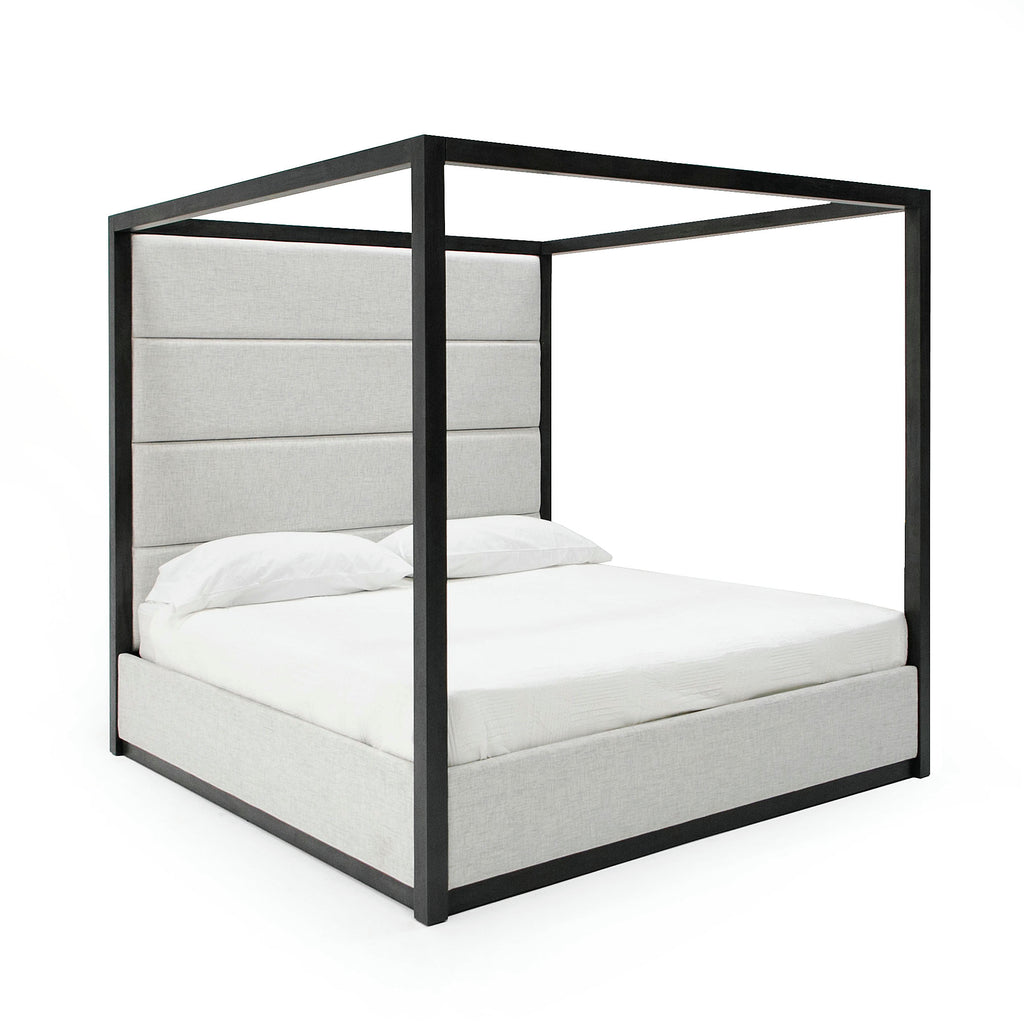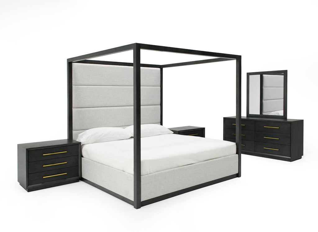 Our Manhattan Canopy Bed set is the ultimate in comfort and luxury. It's plush headboard paired with your soft inviting mattress make it the perfect place to unwind and relax. From the elegant upholstered platform in ivory fabric that cushions you, to the gray wood canopy that encompasses you. Rest assured that you'll enjoy a restful night's sleep for years to come. This set provides for a bed, two nighstands, dresser and mirror in matching gray wood finish. Availiable in both Eastern King and Queen with slats provided. No box spring required.