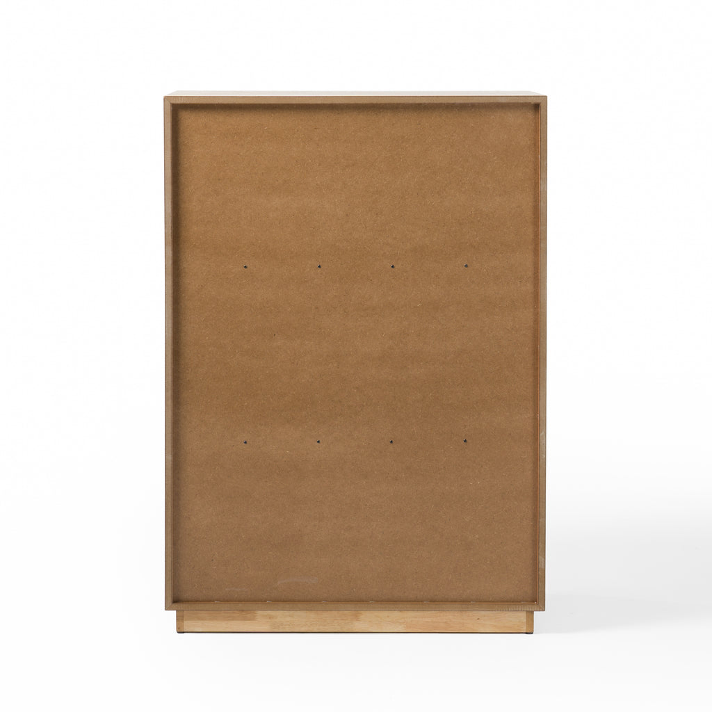 Vertical Chest Solid Wood + Manufactured Wood Color: Natural Wood Finish Five Drawers Soft/Self Close Drawers Brush Nickle Drawer Handle Tip-over Restraint Device Included Drawer Weight Capacity: 33 Lbs. Some Assembly Required
