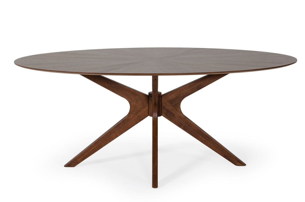 The Prospect Dining Table is a solid wood base table with a walnut finish. This modern, oval table seats 6-8people for a fun and full dining experience. The deep walnut finish and tapered legs give an industrial and mid-century feel to any room. The x shaped base is a classic contemporary silhouette with a touch of morn style.