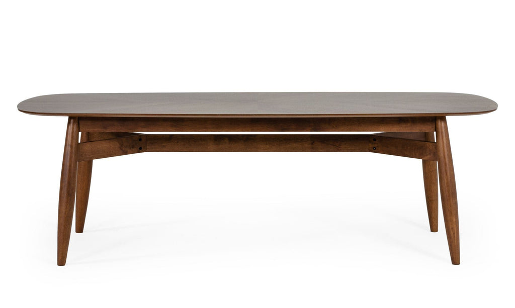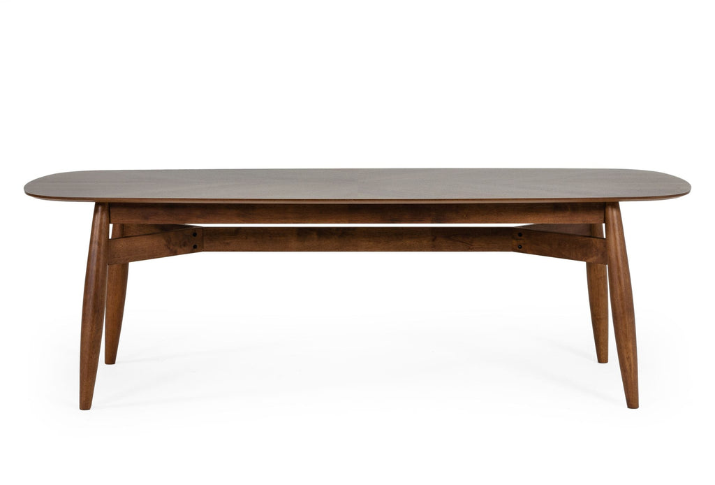 0.75" Thick Beveled-edge Rectangular Walnut finished Ash veneer top Walnut finished solid wood legs and base Seats 8 Some Assembly Required