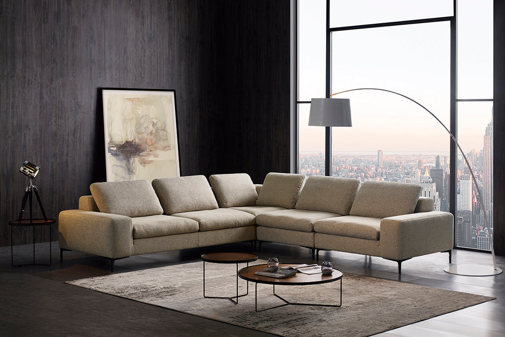Brighten up a corner in your living space with the posh Divani Casa Cascade Modern Beige Fabric Sectional Sofa. Upholstered in smooth beige 100% polyester fabric, it offers extravagant seating that consists of a 3-seater, a corner seater, and a 2-seater allowing you to create a cozy spot in your home. Cushioned seats and backs, long track arms and adjustable headrests boost the ease of comfort it offers. On top of that, it comes with an ottoman to rest your legs that can also function as a coffee table. Completing its fashionable look and providing sturdy support are black angular metal legs with tapered tips. Give your living space that up-to-the-minute designer look with this L-shape modern beige fabric sectional sofa maximizes your space.