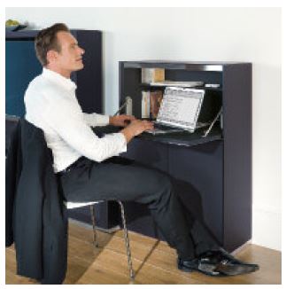 Laptop work station in tempered glass. "Stand Alone" cabinet. White matt glass. Panel in scratch resistant black finish. Units layered... Laptop work station in tempered glass. "Stand Alone" cabinet. White matt glass. Panel in scratch resistant black finish. Units layered with tempered glass. Shock resistant pull down door. Shock resistant door. View more