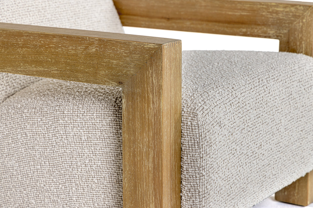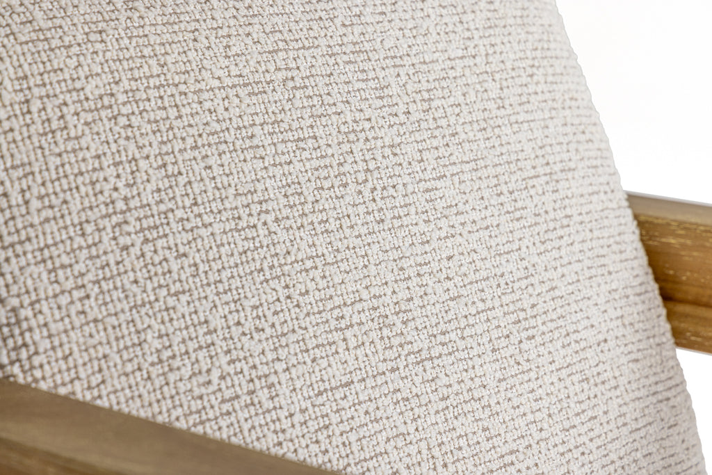 The Modrest Dalhart Accent Chair exudes modern elegance with its inviting beige fabric upholstery and stylish grey wash wood accents. The chair features a comfortable, rounded back and wide armrests, offering a cozy yet contemporary design ideal for any living space. Its minimalist silhouette and textured fabric enhance its visual appeal, making it a perfect statement piece. This chair harmoniously blends comfort and style, elevating interior aesthetics with its sophisticated and neutral palette.