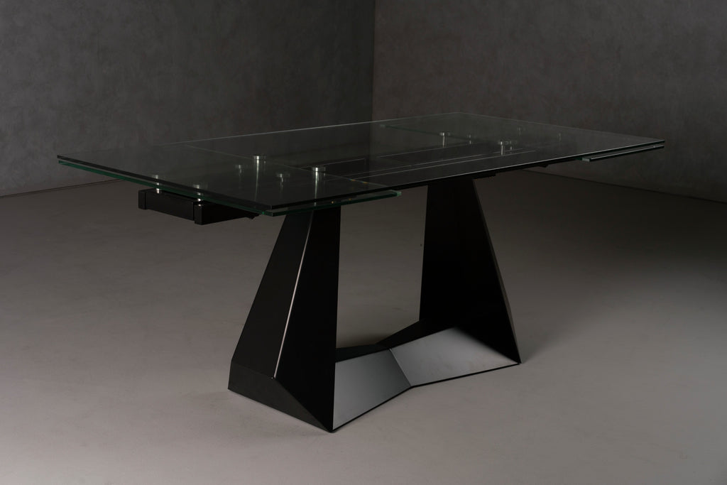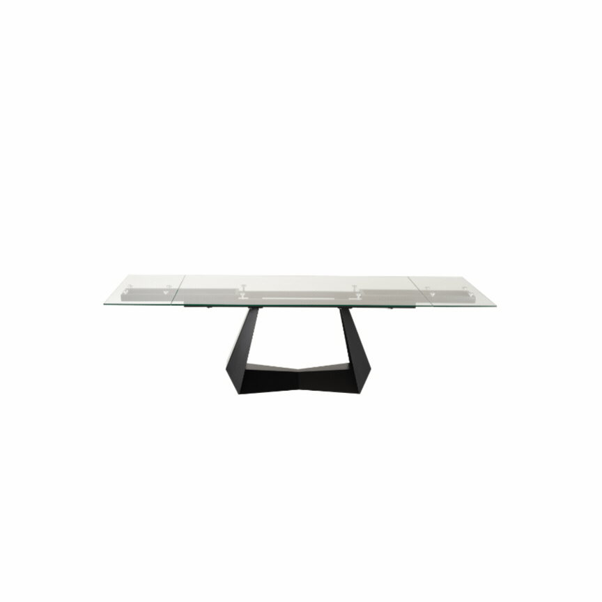 10mm Clear Glass Top Shape: Rectangular Extendable with 2 Leaves Base: Black Powder Coated Steel Base - Pedestal Seats 6 Comfortably Seats 10 Comfortably When Extended Cleaning Instructions: Do not use strong Liquid cleaners Some Assembly Required