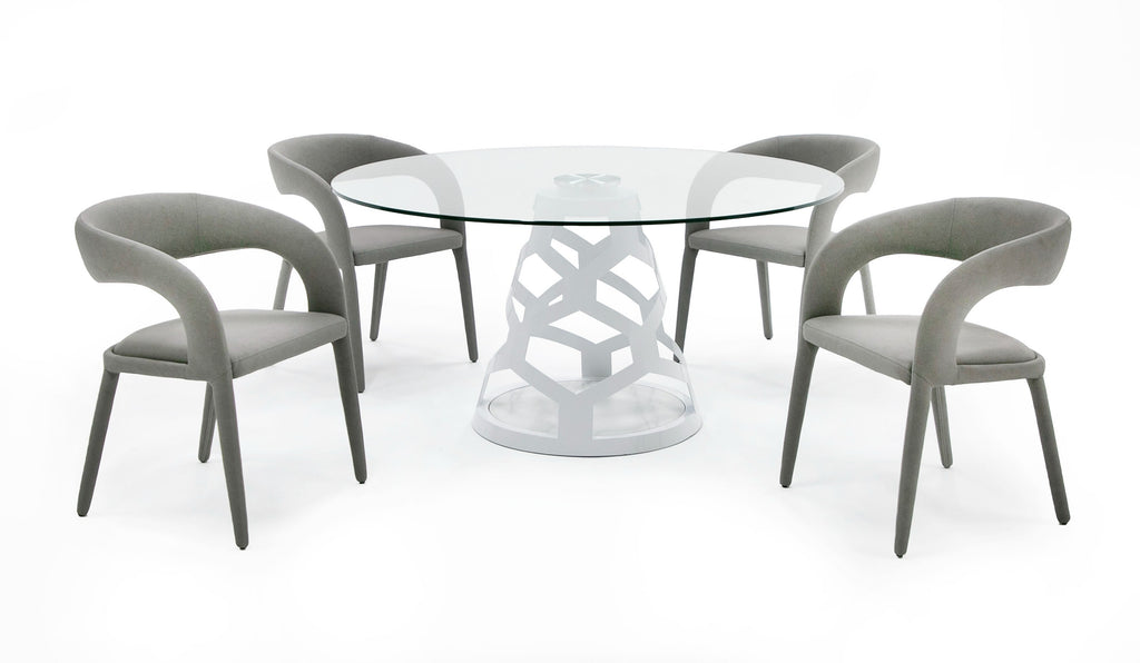 The Modrest Lilly Modern White and Glass Round Dining Table is a sophisticated and elegant addition to any contemporary dining space. This exquisite table features a round tempered glass top that provides a sleek and modern aesthetic, allowing you to showcase the beauty of your dining room decor. The white high gloss base adds a touch of luxury and complements the overall design flawlessly. With its sturdy construction, this dining table is built to last, ensuring long-lasting durability. The round shape encourages social interaction and creates an intimate dining experience. Whether hosting dinner parties or enjoying family meals, this table offers ample space to comfortably accommodate four to six people. The Modrest Lilly Dining Table seamlessly combines style, functionality, and quality craftsmanship, making it a standout piece that will elevate any dining area.