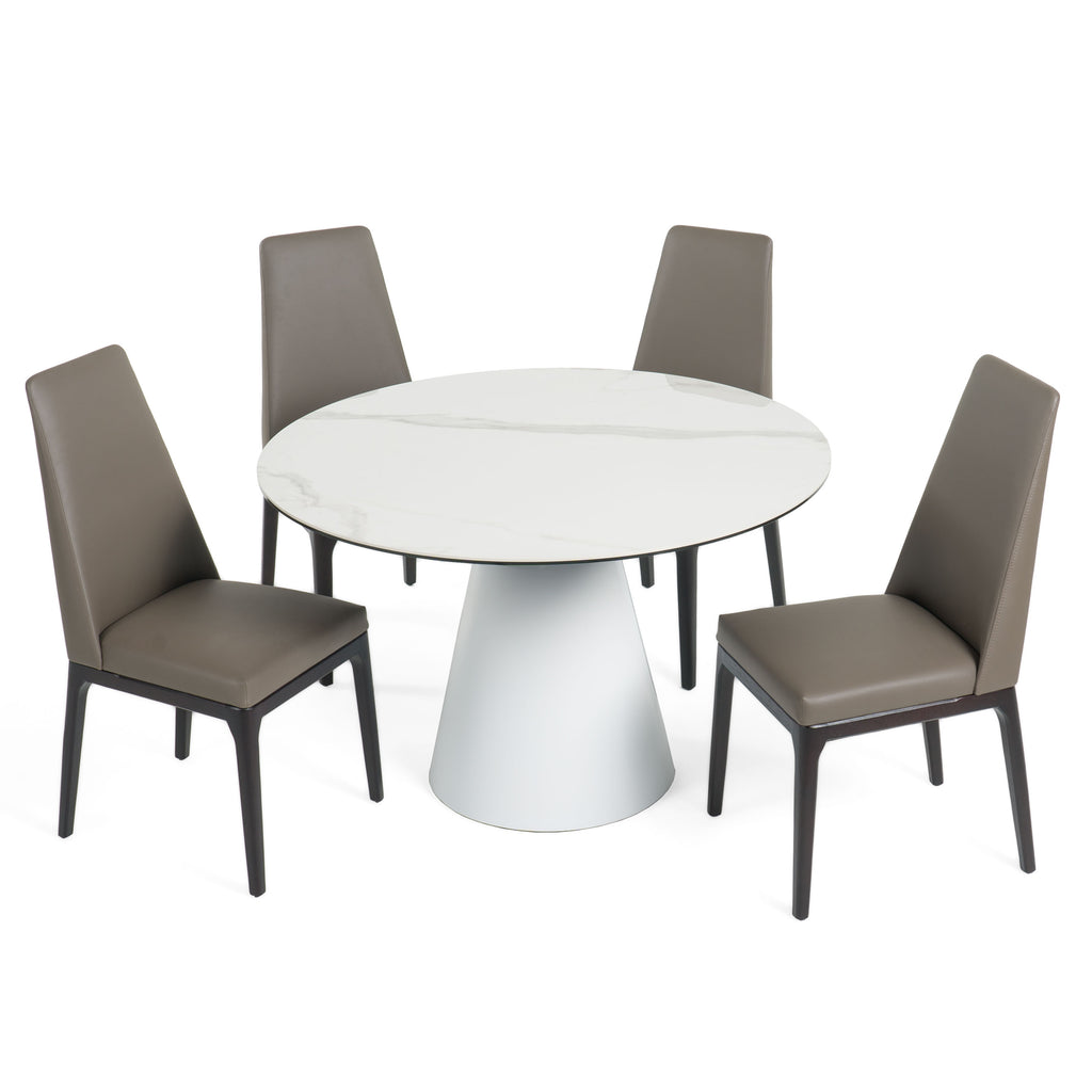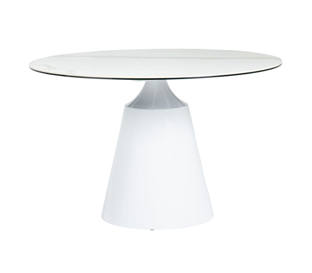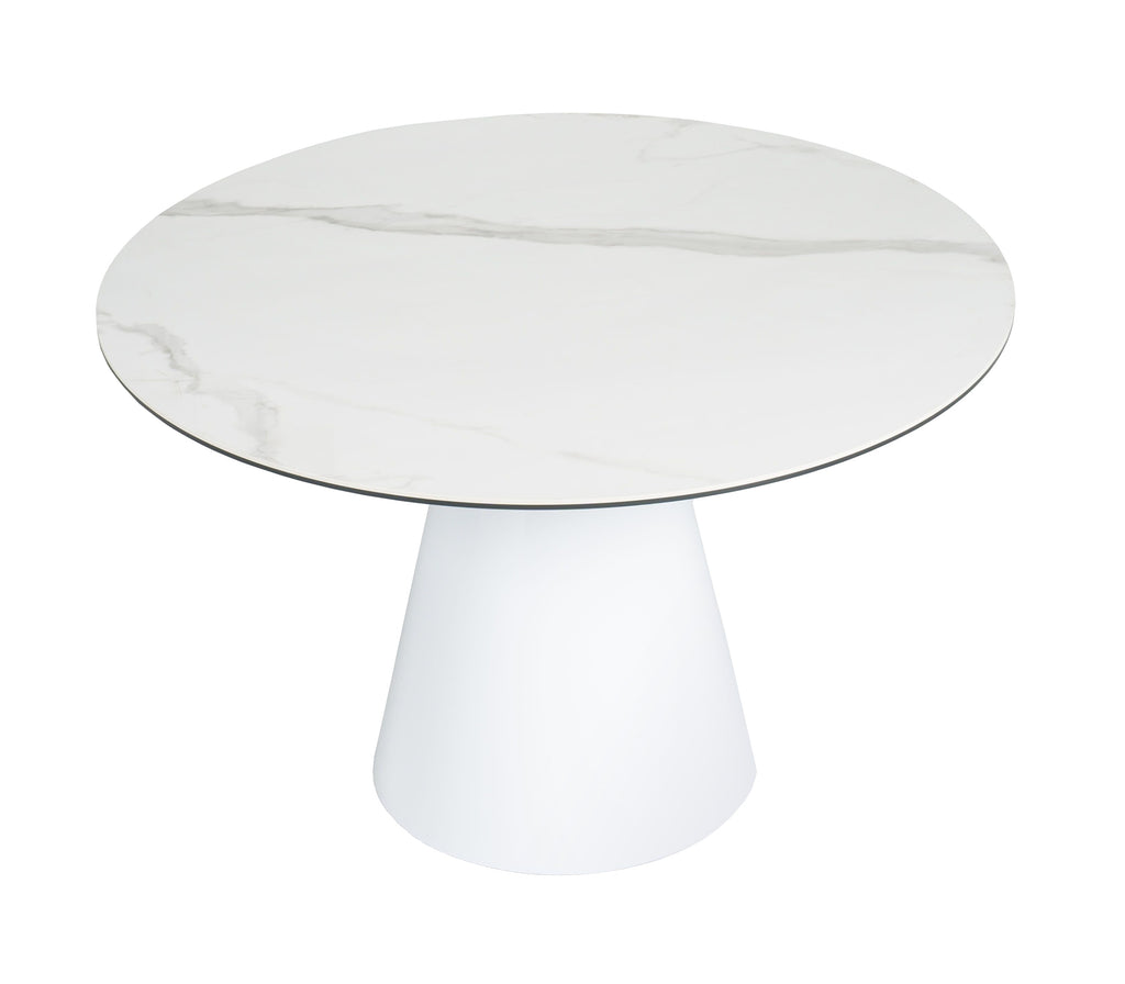 The Edith Round Dining Table is a beautiful addition to any dining room. The white ceramic top has a marble look that creates an elegant atmosphere. The white metal pedestal base evokes an industrial strength and power. Sure to match with anything, this bright dining table is sure to be a dining adventure.