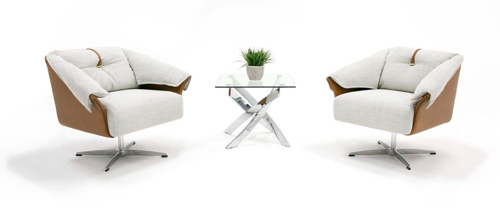 Ohio Swivel Accent Chair is made from combination of Light Grey Fabric and Camel Leatherette. This Retro style chair is comfortable with padded cushions and armrests and has a metal base. The back cushion is decorated with contrast stripe and metal button.
