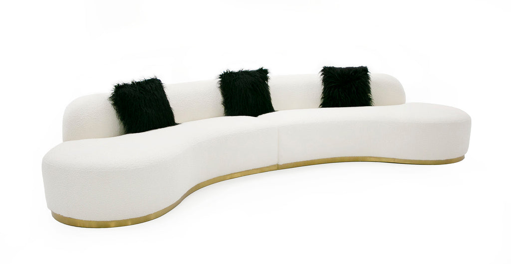 Off-White Fabric Upholstered (100% Polyester) Symmetrical Curved Sectional Configuration: Left facing 3-seat + Right Facing 3-Seat Brushed Gold Stainless Steel Base 3 Black Faux-Fur Throw Pillows Included Tight Upholstered seat and back Seat Fill: Foam Back Fill: Foam Plywood and Solid Pine Frame Seat Capacity: 6 Weight Capacity: 2600 lbs.