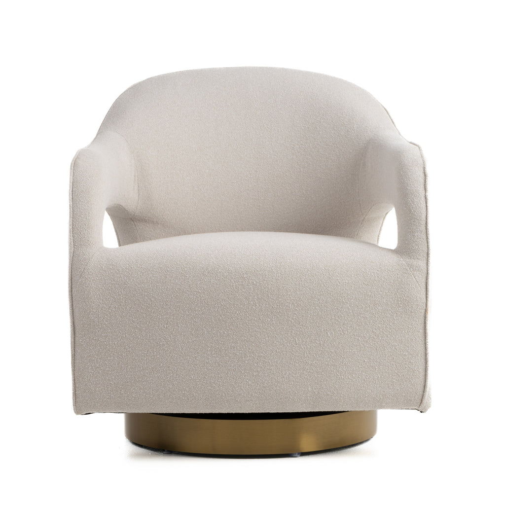Modrest Worley - Modern Beige Fabric + Gold Swivel Accent Chair is an elegant and contemporary armchair designed for modern interiors. This chair features a swivel base in a luxurious matte gold finish, paired with soft beige upholstery made from 100% polyester fabric. The frame is constructed from stainless steel and manufactured wood, ensuring durability and stability. With its flared arms, cushioned back, and pocket spring seat, the chair offers both comfort and style, making it a perfect addition to any living space.