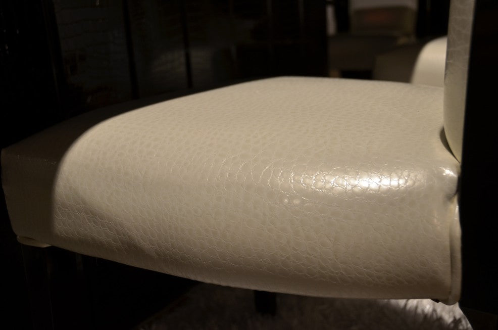 The Armani Xavira transitional X leg dining side chair with leatherette upholstery has a tall, arched back rest, providing it with creative sophistication. The innovative high gloss X leg design and front legs give able support to this comfy, ergonomically designed chair.