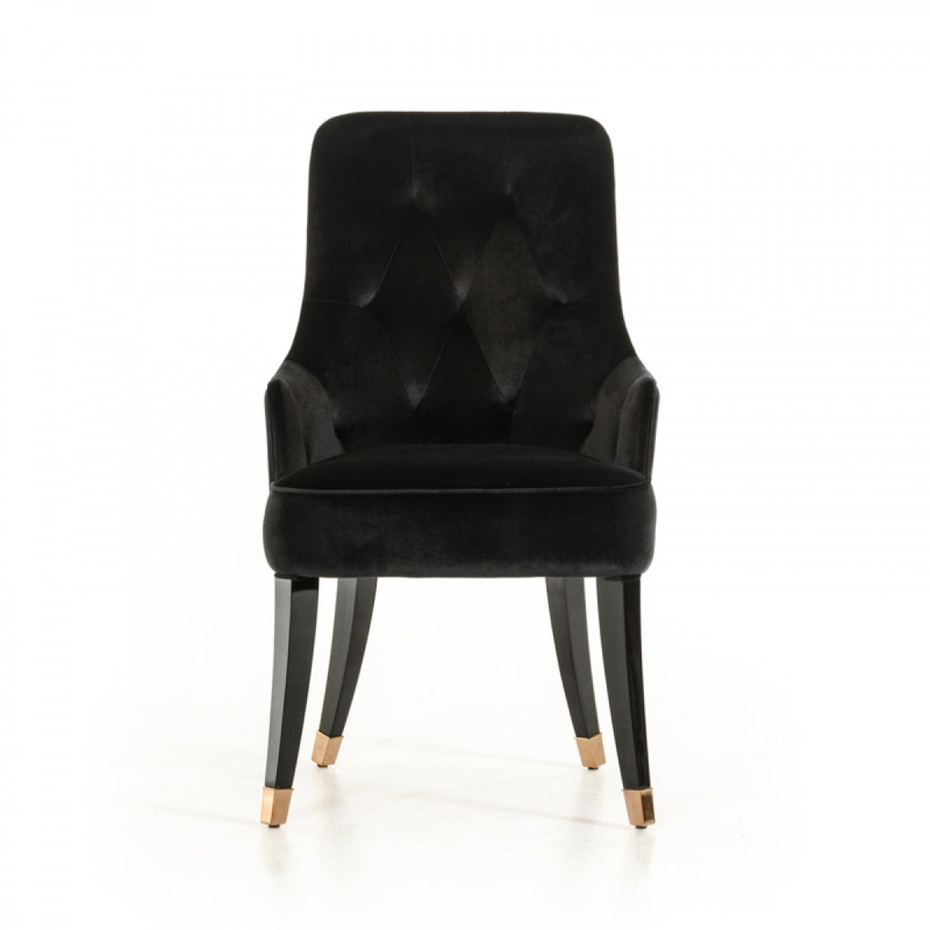 The Black Velvet Fabric covers the seat and back, elevated by tufted stitching to create a visual a combination of Classic and Contemporary styles. Sleek black gloss legs end in Rose Gold caps to create a luxurious finish.
