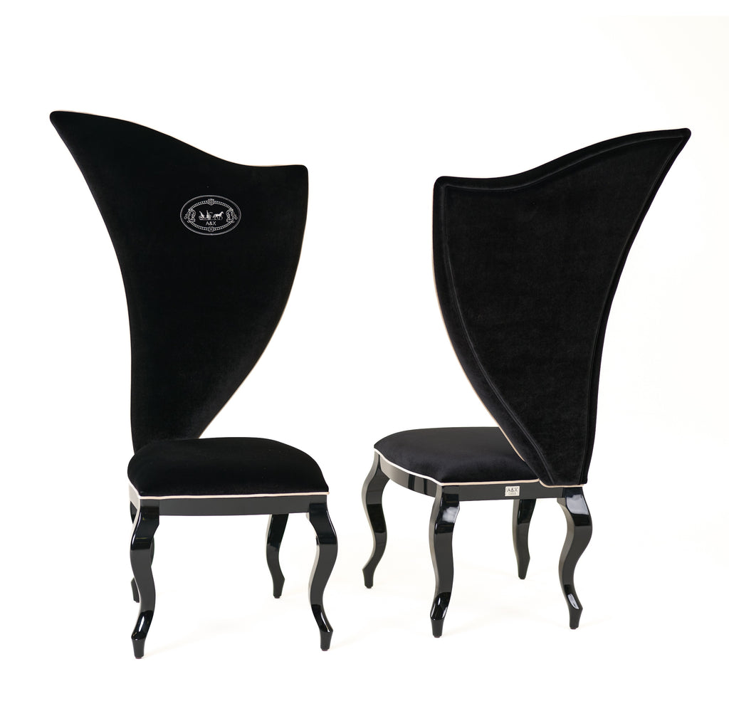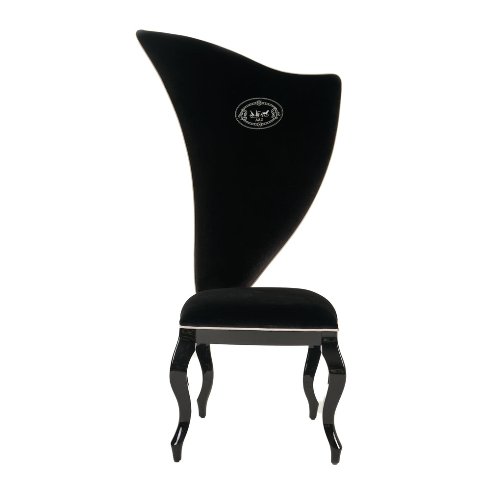 The A&X Sovereign Dining Chair is a marvel of traditional design. The unique silhouette of the back is wrapped in a luxurious black velour fabric. White piping ends the edges of the upholstery cleanly to create a finished elegance. The curvilinear black high gloss frame and legs add a quiet serenity to this bold piece.