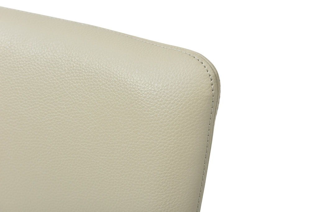 This set of 2  Taryn - Modern Light Grey + Stainless Steel Dining Chair features a dainty triangular stainless steel frame upholstered in dainty light grey leatherette. This modern dining chair with medium-height back features curved corners and back edge. Rubber stoppers on legs prevent damage on your floor.