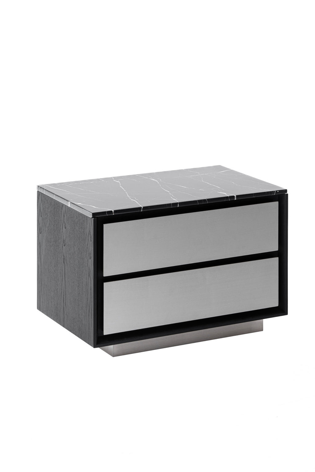 The Modrest Concord Nightstand features a striking modern design with a luxurious black marble top that showcases elegant white veining. Its sleek black ash body complements the contemporary aesthetic, while two spacious drawers with aluminum facades provide ample storage. The minimalist silhouette exudes sophistication, enhanced by a polished base that adds a touch of refinement. This nightstand seamlessly blends functionality with style, making it an ideal addition to any modern bedroom.