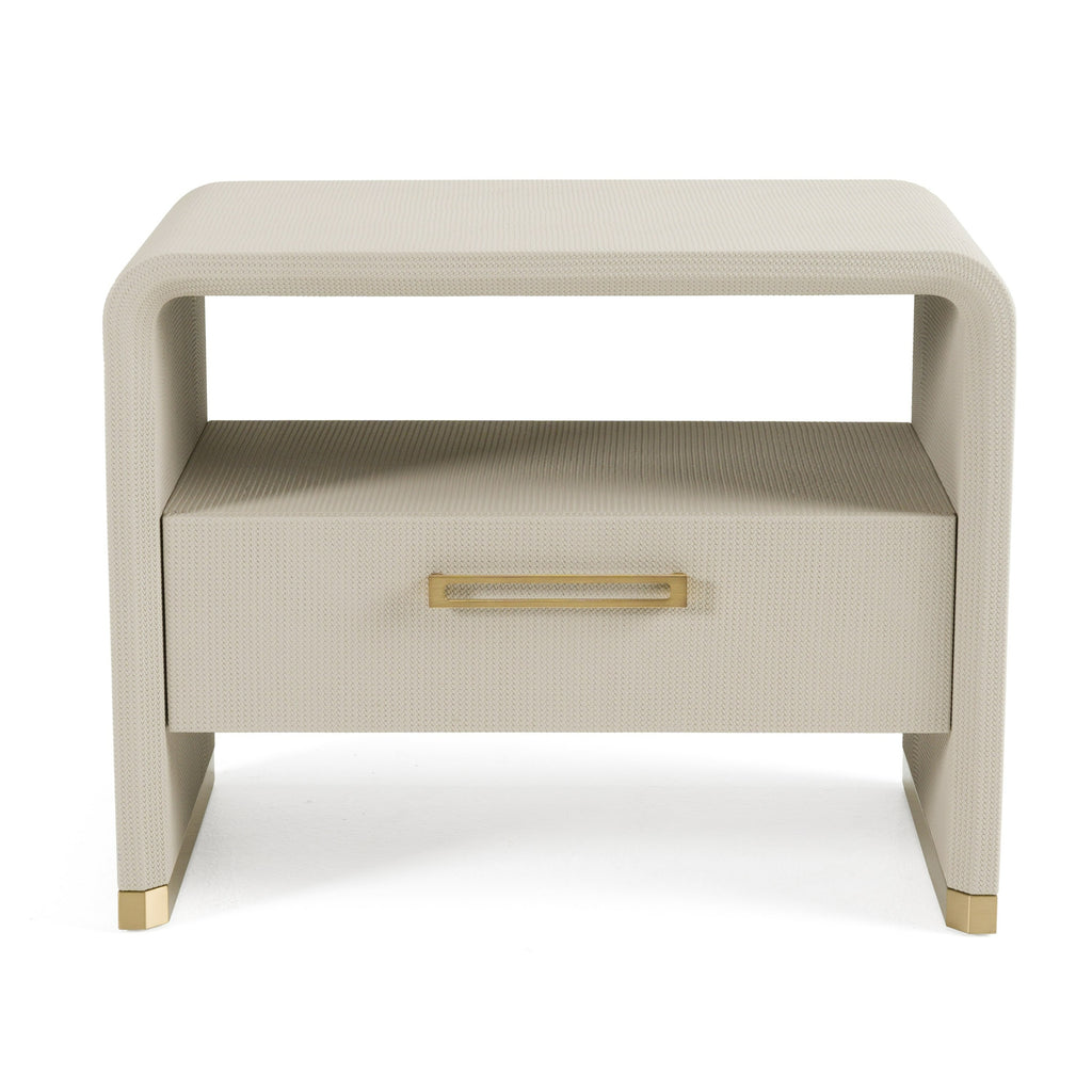 Fully Upholstered Nightstand Upholstered In Weaved Herringbone Leatherette Color: Beige Frame Construction: Manufactured Wood 1 Drawer Gold Metal Handle Fully... Fully Upholstered Nightstand Upholstered In Weaved Herringbone Leatherette Color: Beige Frame Construction: Manufactured Wood 1 Drawer Gold Metal Handle Fully Assembled View more