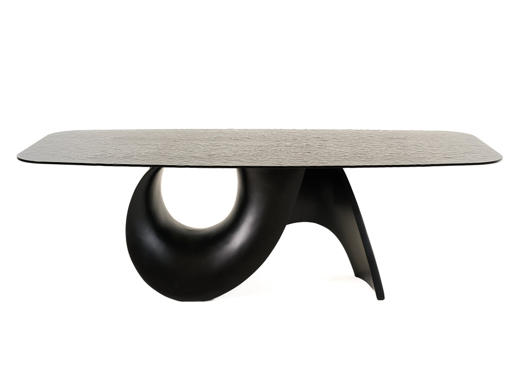 The Modrest Neptune Modern Grey Wave Glass + Black Dining Table showcases a striking contemporary design that elevates any dining space. Featuring a uniquely sculptural black base with a fluid, wave-like form, it perfectly supports the textured grey glass top. This table artfully combines elegance and modernity, making it a captivating centerpiece. The table accommodates up to 8 people, offering ample space for gatherings. Its bold aesthetic and functional design make it an ideal choice for stylish dining experiences.