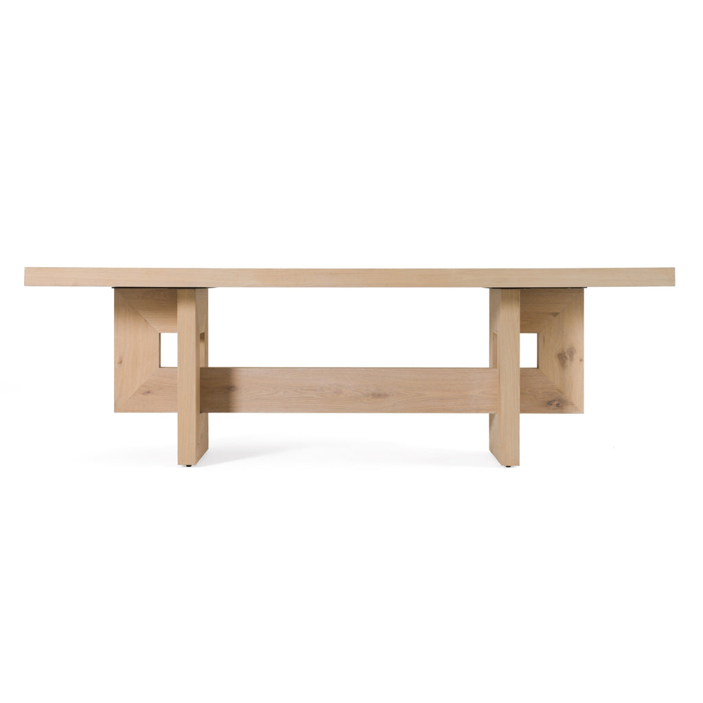 The Modrest Mineloa Dining Table exudes modern elegance with its natural white oak finish. Its clean lines and minimalist aesthetic make it a stunning centerpiece for any dining space. The unique design features a bold geometric base, providing both stability and visual interest. The table's generous surface area is perfect for entertaining or family meals, harmonizing style and functionality. This table accommodates up to 8 people, making it ideal for gatherings and celebrations, while its light wood tones enhance the warmth and brightness of your dining area.