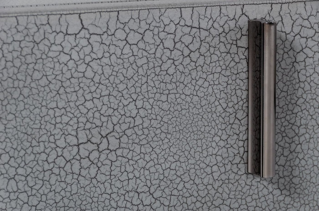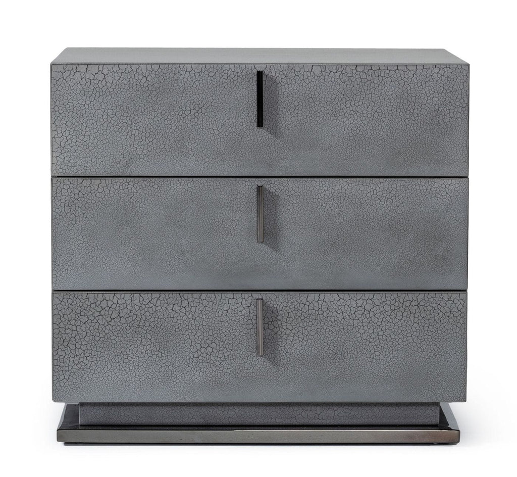 The Buckley Bed is a gorgeous example of modern design. A channel tufted oversized headboard creates height and length in your bedroom. Two nightstands with grey crackle lacquer finish and gun metal accents are included with this purchase and they fit perfectly into the wings of the extended headboard. This low profile bed is a modern masterpiece and one of the most luxurious sets you will ever have the pleasure of laying on.