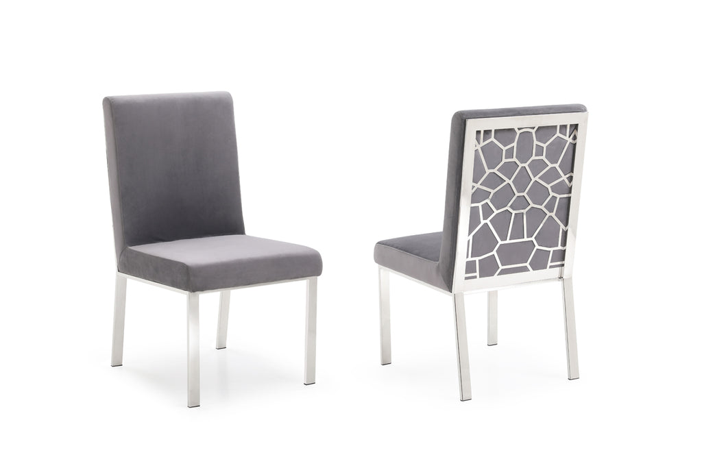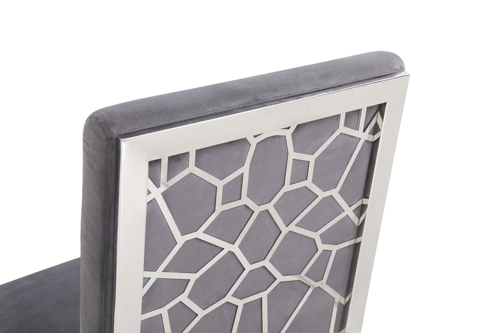 Add glam to your dining room with the Modrest Reba Modern Grey Velvet & Stainless Steel Dining Chair. Donning simple lines, it boasts of a full back and seat design upholstered in silky grey velvet fabric. A polished stainless steel frame that features a cobweb back design and four legs provide sturdy support and also offers a stunning contrast to the grey fabric. This modern dining chair allows you to enjoy a classic style dining experience in your home.